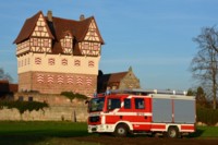 Der Hintergrund bleibt, die Fahrzeuge wechseln. Das HLF 10/6 im Jahr 2015 vor den Schloß in Neunhof... |